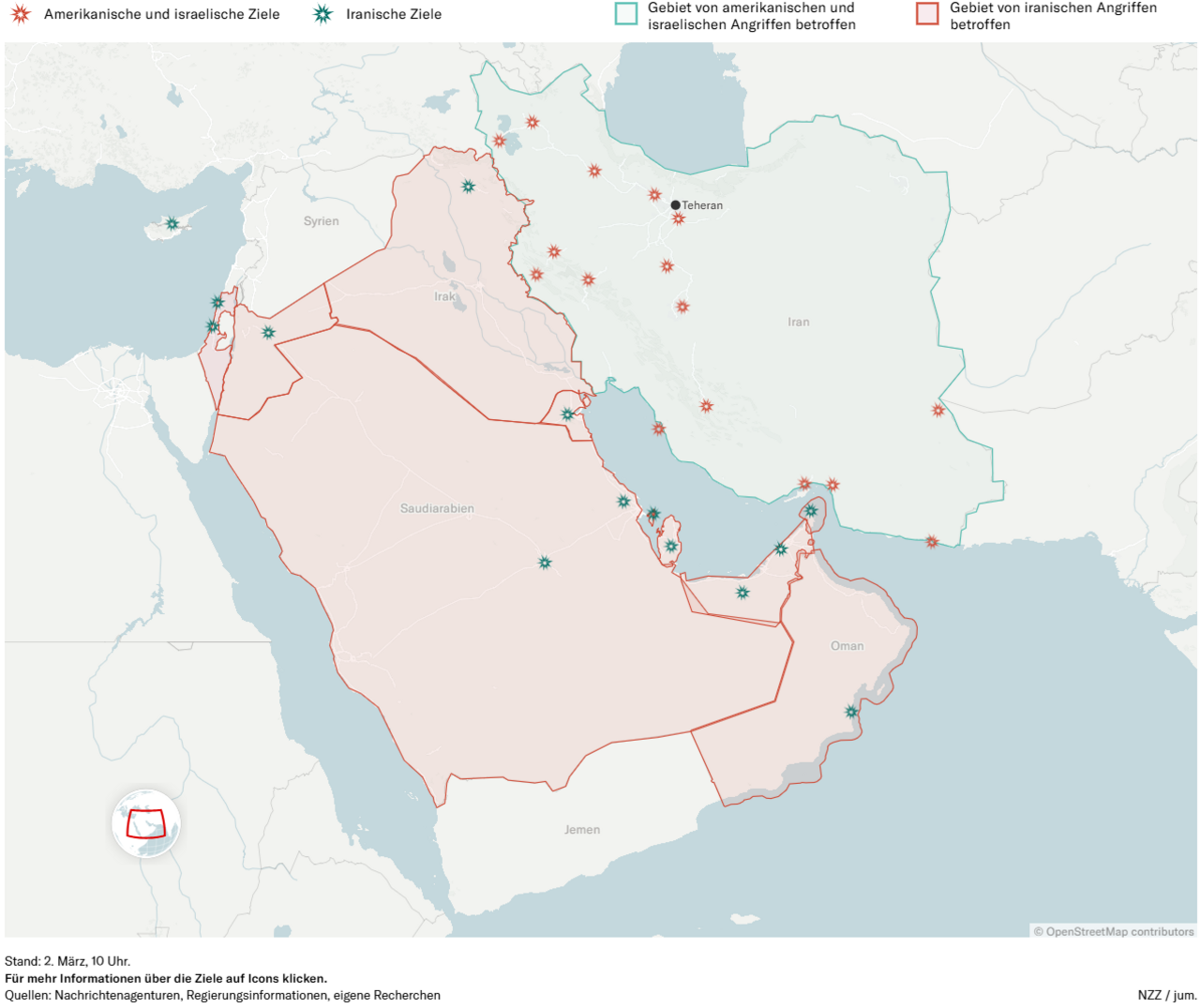 Die geopolitische Lage im Nahen Osten hat sich durch gemeinsame Luftangriffe der USA und Israels auf strategische Ziele im Iran am 28. Februar 2026 zugespitzt. Der Iran im Gegenzug beschießt US-Basen im Nahen Osten und Israel mit Raketen (siehe Grafik), wodurch wichtige Luftfahrt-Drehkreuze wie Dubai und Doha den Betrieb zeitweise einstellen mussten und die Schifffahrt in der Straße von Hormus zum Erliegen gekommen ist. Angesichts der Tragweite dieser Ereignisse – insbesondere der Berichte über den Tod des Obersten Führers Ajatollah Ali Chamenei – möchten wir Ihnen eine kurze Einordnung der aktuellen Marktentwicklungen und unserer strategischen Einschätzung geben.